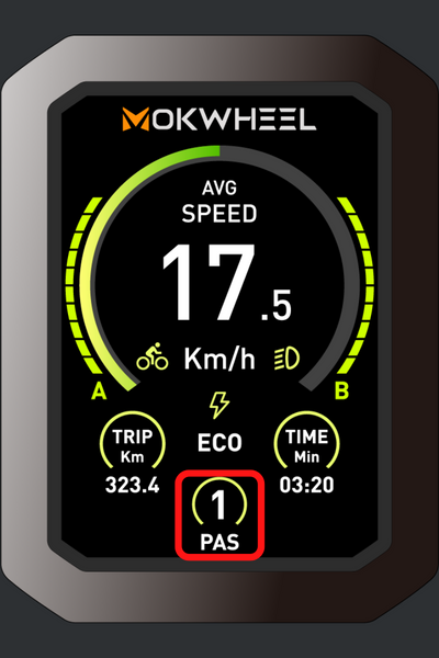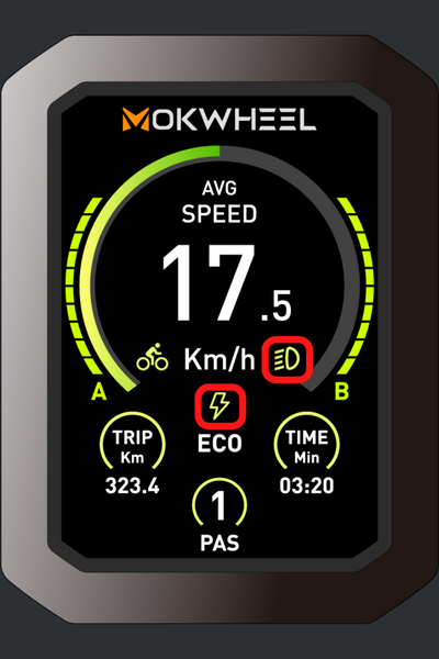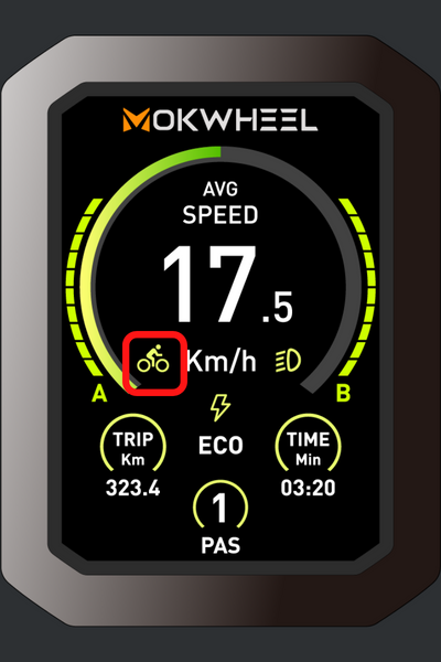 Fonction d'affichage Vitesse, niveau de vitesse assistée, puissance de la batterie, kilométrage total, kilométrage par trajet, durée par trajet, code d'erreur.Description du contenu de l'affichage Tous les contenus affichés (apparaissent dans la seconde qui suit la mise en marche de l'Ebikes) Appuyez sur MODE et maintenez-le enfoncé pour mettre le vélo en marche.