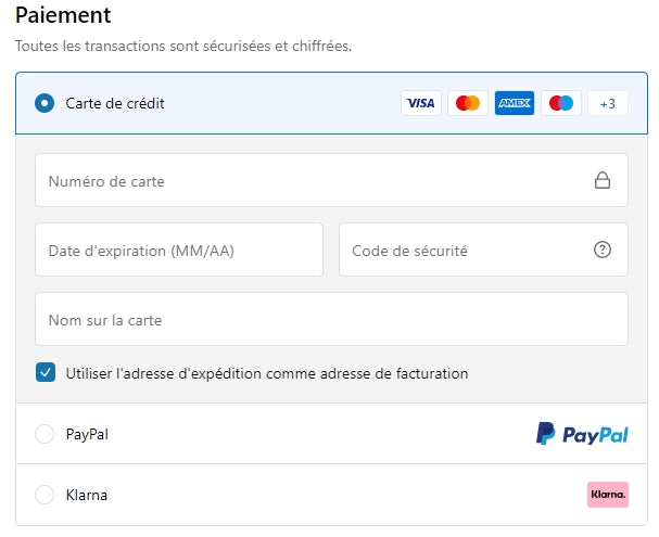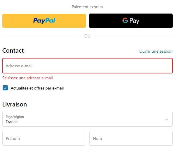 (1)Sur la page de la caisse, choisissez la méthode de paiement souhaitée. Vous pouvez choisir la méthode de paiement rapide par Paypal, Google Pay, Apple Pay, si vous avez déjà un compte.